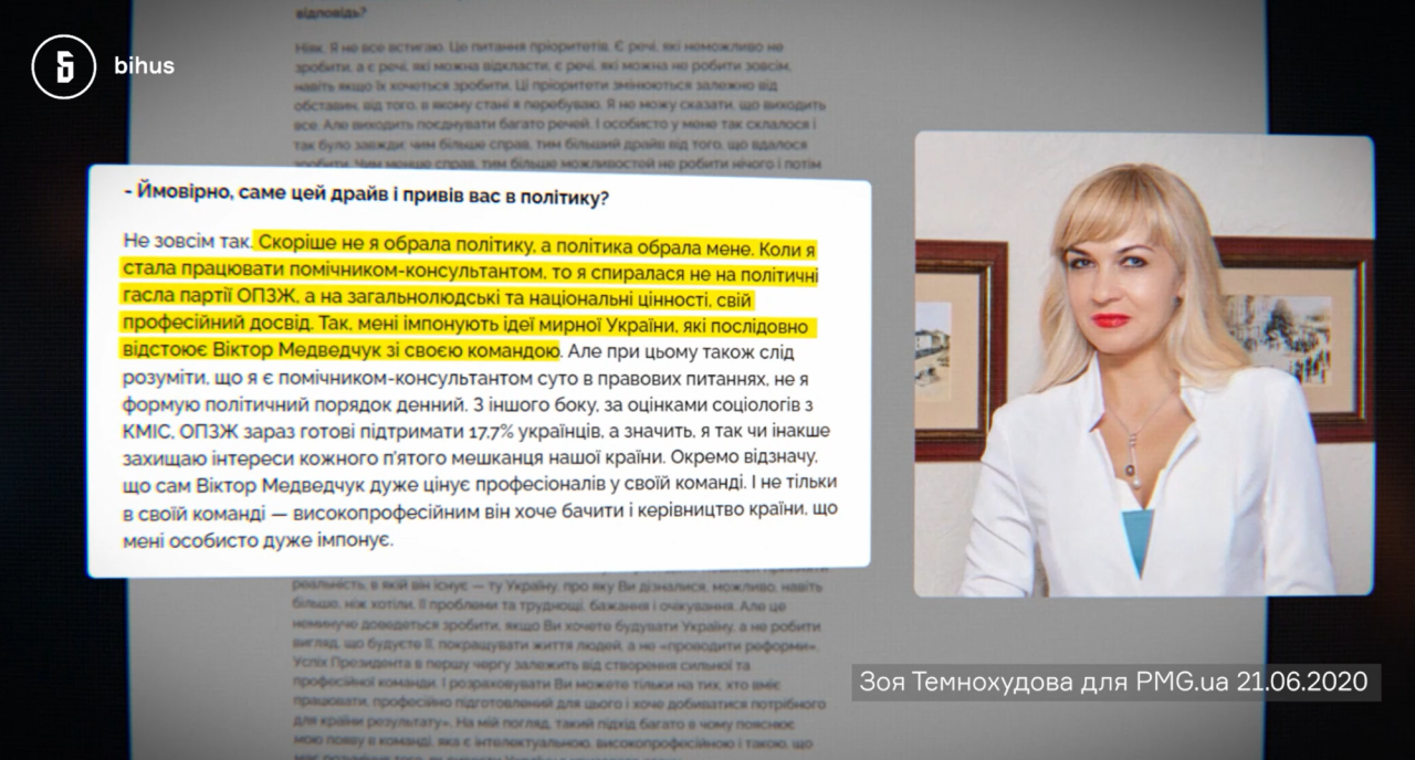 «Важную должность в структурах украинской адвокатуры занимает бывшая парламентская помощница Виктора Медведчука Зоя Темнохудова», — отмечают журналисты.