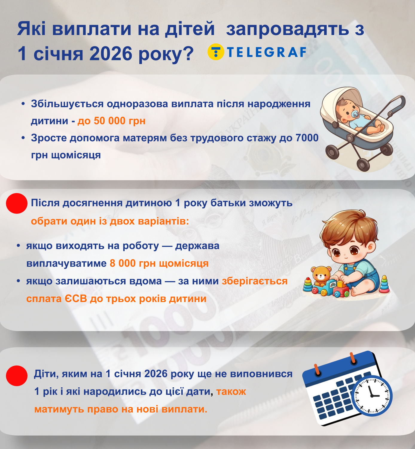 Важный момент: семьи, ребенку которых по состоянию на 1 января 2026 еще не исполнится год, продолжат получать нынешние 860 грн и дополнительно — 7 000 гривен в месяц до достижения ребенком 1 года.