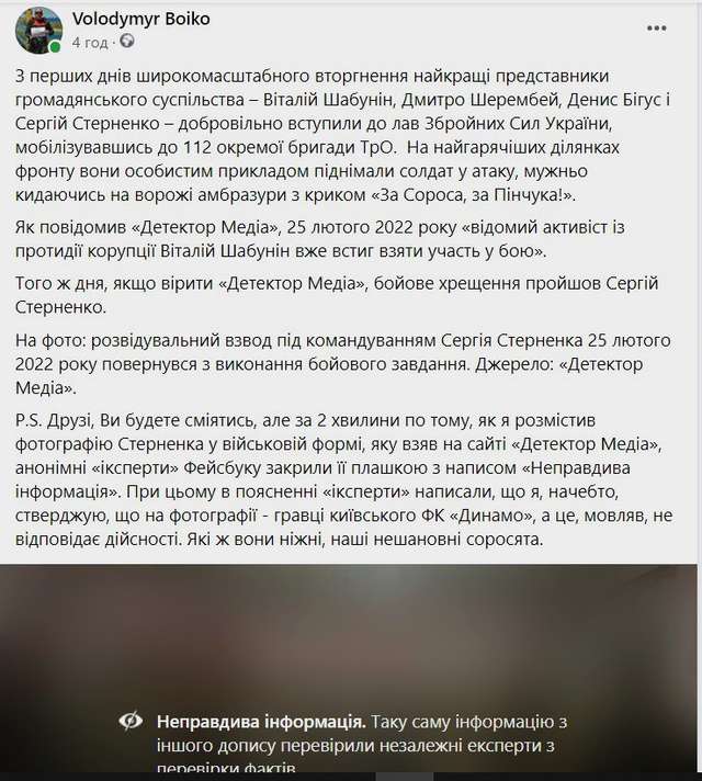 UPD: Друзья, Вы будете смеяться, но через 2 минуты после того, как я разместил на своей Фейсбук-странице фотографию Стерненко в военной форме, которую взял на сайте «Детектор Медиа», анонимные «иксперты» Фейсбука закрыли ее плашкой с надписью «Неправдивая информация».