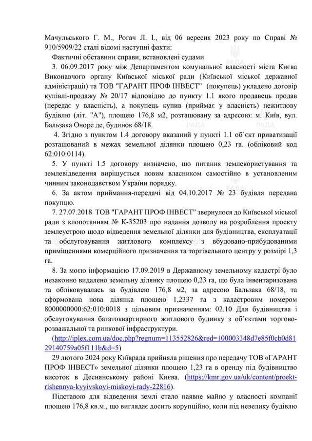 29 февраля 2024 года Киевсовет принимает решение о передаче ООО «ГАРАНТ ПРОФ ИНВЕСТ» земельного участка площадью 1,23 Га в аренду под строительство высоток в Деснянском районе Киева.