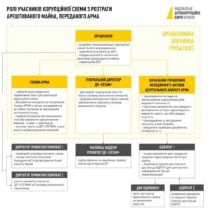 Глава АРМА Антон Янчук (упоминание фамилии в СМИ) согласился на предложение Довбенко. Он обеспечил принятие необходимой нормативной базы, которая позволила создать видимость законности манипуляциям с арестованным имуществом в интересах преступников. Одним из них стал конкурс по отбору торговой площадки, по условиям которого победу в нем могла одержать только одна структура – ГП «СЕТАМ». Организатор также привлек к группировке директора этого госпредприятия Виктора Вишнева (упоминание фамилии в СМИ). Тот мог обеспечить проведение электронных торгов с целью реализации вещественных доказательств по заниженным ценам, в которых создать условия для победы заранее определенных юридических лиц.