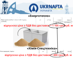 Кроме того, сама же «Укрнафта» для устройства инженерных сооружений на объектах нефтегазовой отрасли в Роменском районе Сумской области в том же ноябре заказывала другой компании «Химия-Спецтехника» песок по 400 грн/куб. м, что почти втрое дешевле.